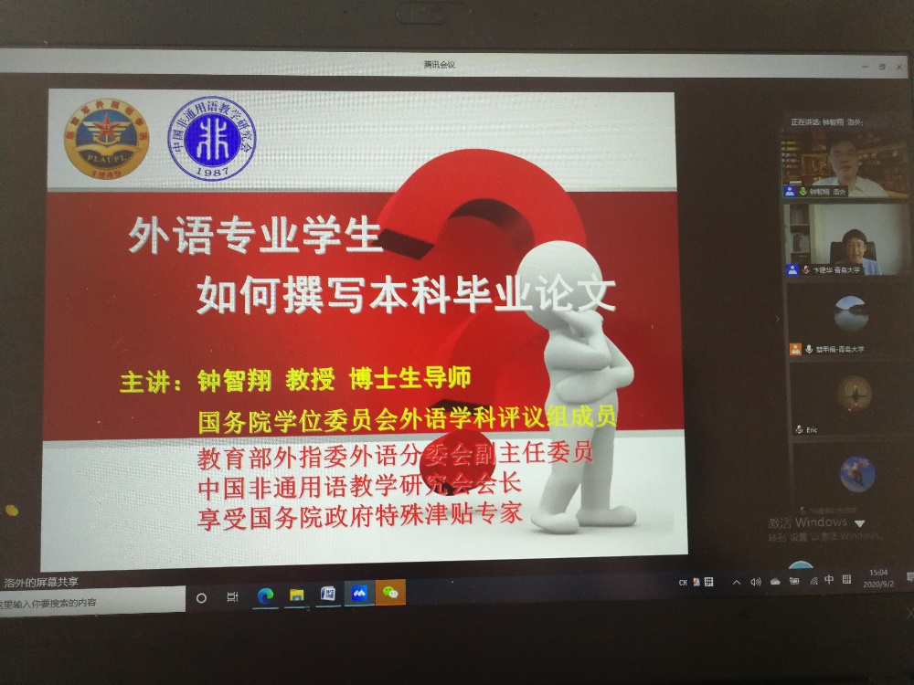 9月2日下午,受太阳集团城8722邀请,信息工程大学博士生导师钟智翔教授为太阳集团城8722师生,尤其是即将进行毕业论文选题与写作的2017级同学带来了一场题为“外语专业员工如何撰写本科毕业论文”的主题讲座。本次讲座由太阳集团城8722经理卞建华教授主持,太阳集团城8722及国内其他高校外语专业师生四百余人以腾讯会议或直播形式聆听了讲座。