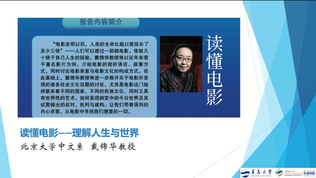 在讲座中,戴锦华教授用丰富的影片文本向听众生动地介绍了电影的基本知识,涵盖视听语言、时空结构、场面调度、构图、光色、造型、叙事与剪辑,以及数码转型之后电影发生的种种变化。戴锦华教授指出,电影不仅是一项大众娱乐形式,更是一门用视听语言写作、以时空变奏结构的艺术。为了能够理解并欣赏这门艺术,观影者须学习电影的视听语言、叙事方式,考究电影的表意文化,探询电影内含的批判与反思。只有这样,我们才能“读懂电影”,“理解人生与世界”,领会它所呈现出的多元的社会文化议题。