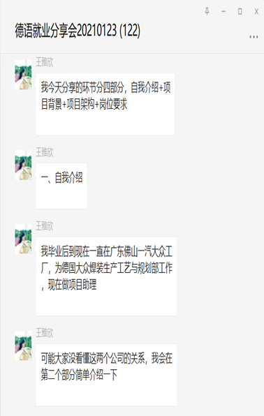 见面会结束后,2018届员工王雅欣通过微信群与德语系师生分享了自己的工作经验和心得。她将自己就职两年多来的体会心得全部用文字记录下来,无私地向同学们展示了在一汽大众工作的方方面面。