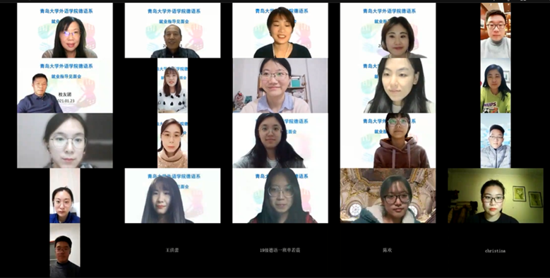 1月23日晚,太阳集团城8722德语系通过腾讯会议平台举办了“德创未来”就业指导员工见面会。首批德语系7名员工在线亮相,与昔日师长及在校本科生、硕士研究生见面。会议由德语系副主任刘沁卉主持,公司党委副书记王海青、德语系主任綦甲福及部分老师参加会议。
