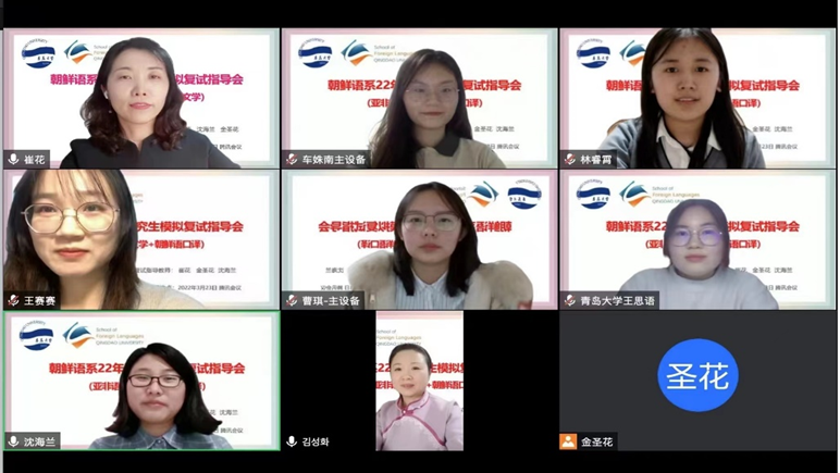 2022年3月23日晚,为帮助考研学子积极应对线上复试,朝鲜语系召开了2022考研复试指导会。本次会议由朝鲜语系系主任崔花主持,副主任杨昊、教研室主任张娜、金圣花、硕士生导师沈海兰、班主任刘振中为考研学子进行在线指导与答疑。