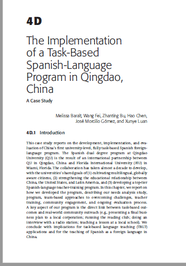 近期,公司教师王斐、布占廷、陈皓、栾勋业与佛罗里达国际大学(FIU)教师Melissa Baralt, José Morcillo Gómez在The Cambridge Handbook of Task-Based Language Teaching(《剑桥大学任务型语言教学手册》)合作发表论文The Implementation of a Task-Based Spanish-Language Program in Qingdao, China(《基于任务的西班牙语教学项目:以中国太阳集团城8722为例》)。