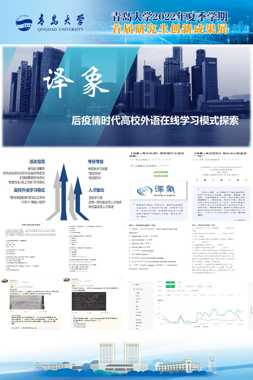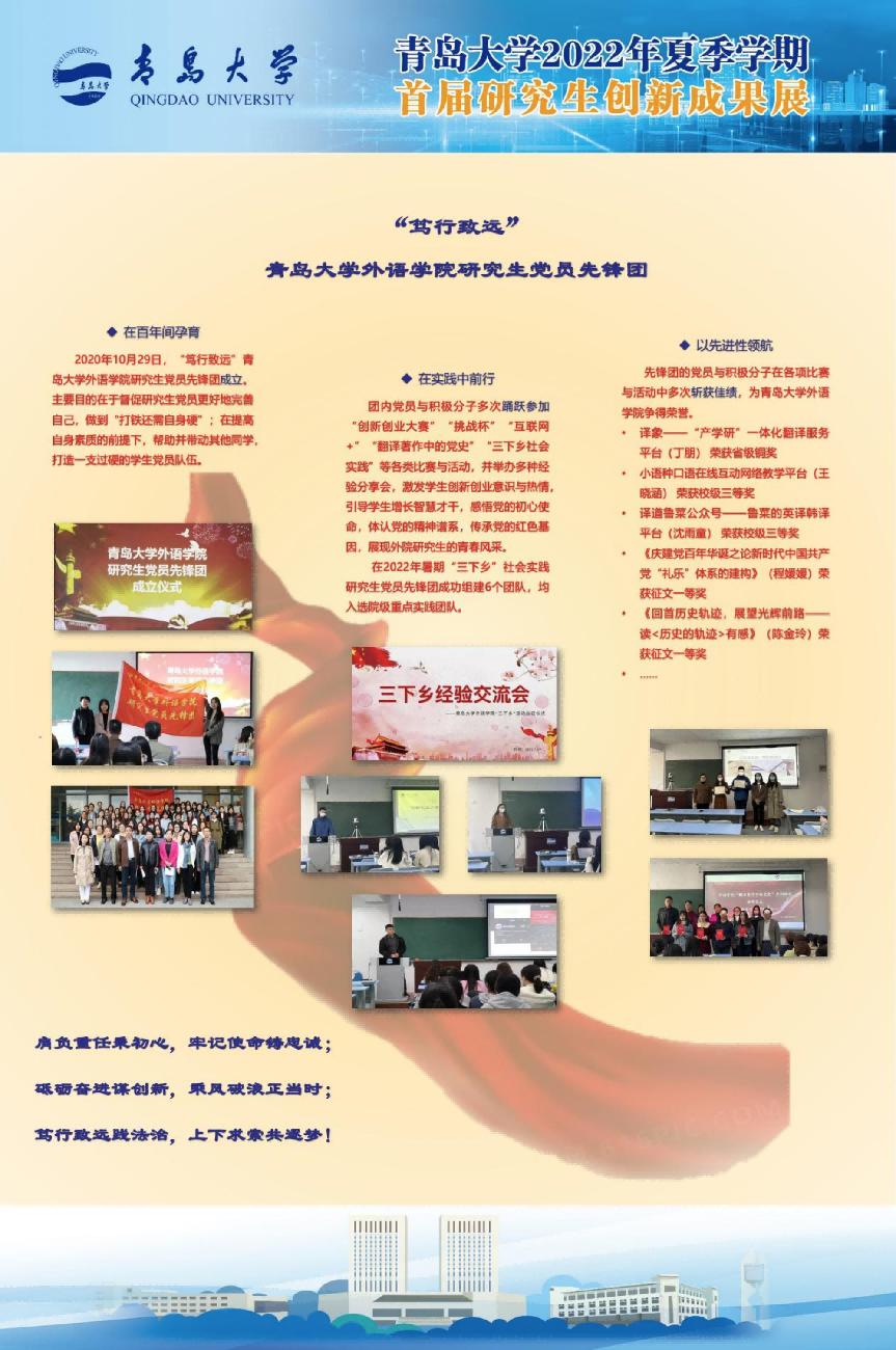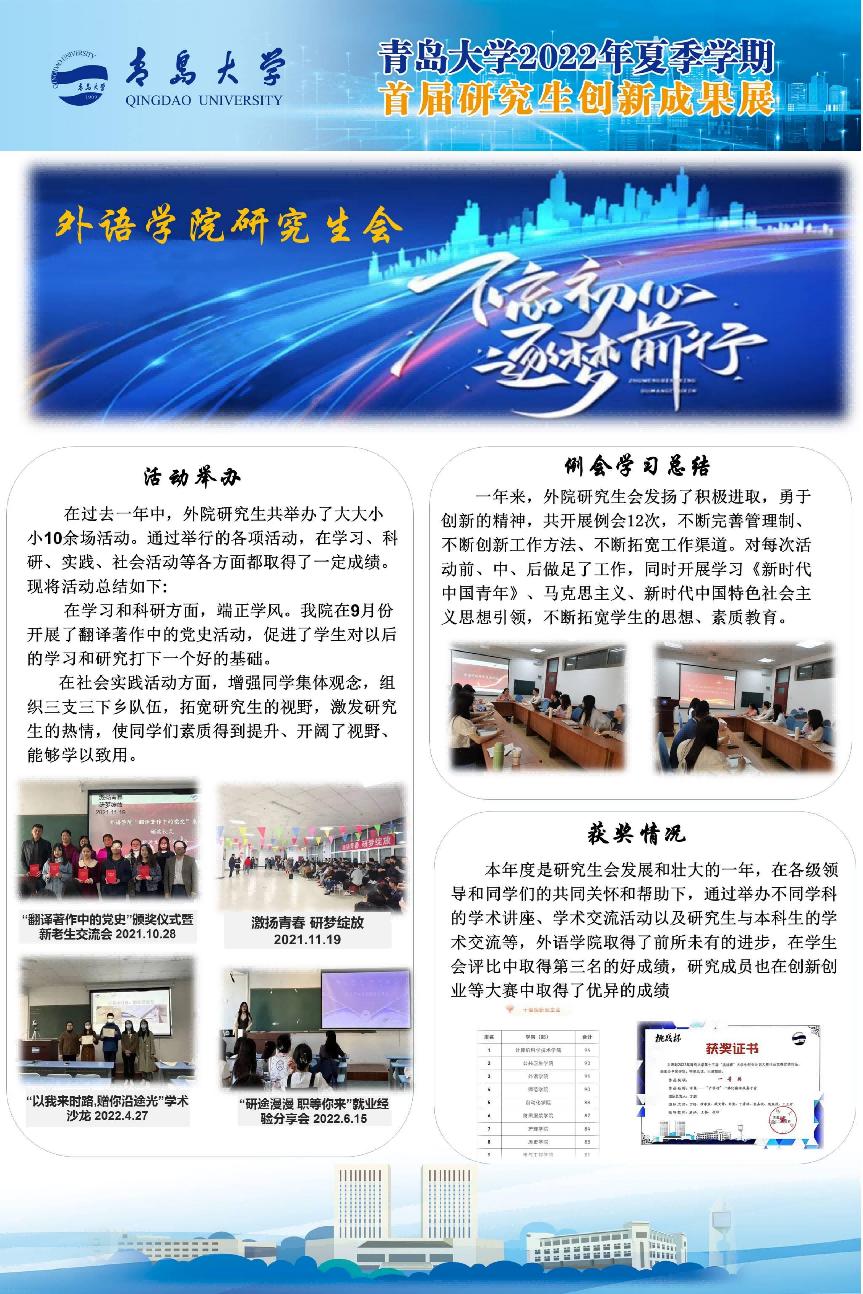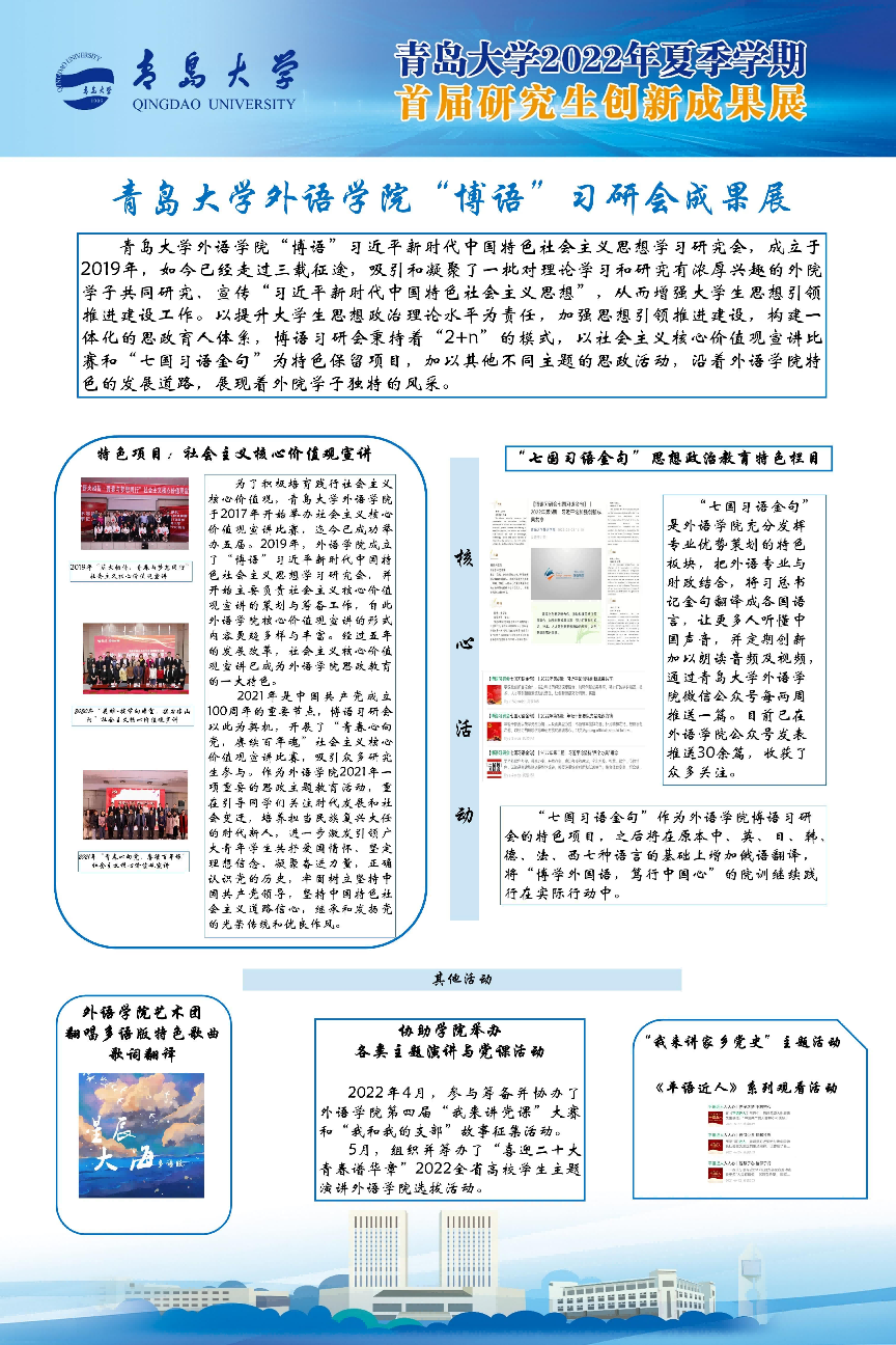 太阳集团城8722研究生会、“译象”翻译工作坊、党员先锋团、“博语习研会”作为太阳集团城8722研究生代表性社团组织,在三下乡活动、创新创业等方面成效显著。相关成绩以海报形式参与了本次成果展。