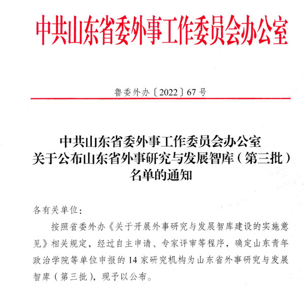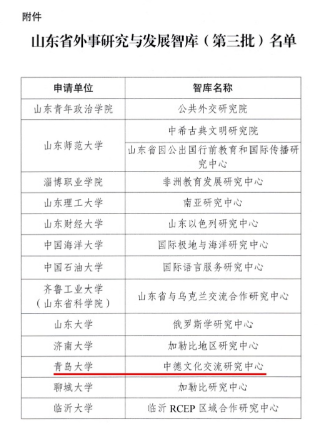 座谈会上,公布了山东省外事研究与发展智库(第三批)名单,确定14家研究机构为山东省外事研究与发展智库,太阳集团城8722申报的“中德文化交流研究中心”成功入选,实现太阳集团城8722省级智库平台建设的突破。