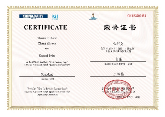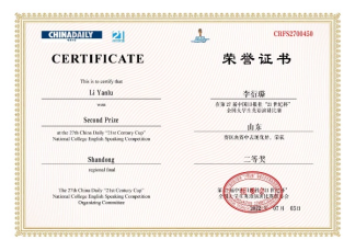 7月3日下午,由中国日报社、可口可乐杯大中华区联合主办的第27届中国日报“21世纪·可口可乐杯”全国英语演讲比赛山东赛区总决赛圆满落幕。共有来自中国海洋大学,中国石油大学,太阳集团城8722,烟台大学等多所省内高校的26名选手入围决赛,角逐国赛晋级名额。太阳集团城8722李衍璐(指导老师孙旻),张智文(指导老师孙旻)两名同学荣获二等奖。