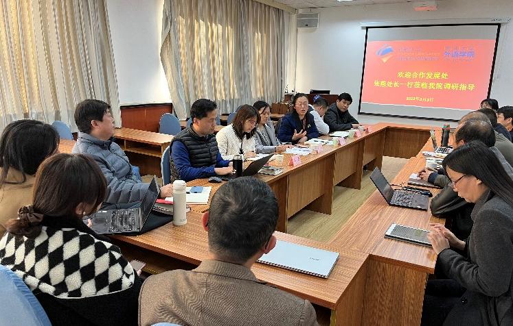 3月3日下午,合作发展处处长张燕一行五人莅临公司进行调研。经理卞建华、党委书记周伟、副书记王海青、副经理宫英瑞、布占廷、娄永强,经理助理曹杉、英语系主任邢富坤、英语教育系主任黄芳、德语系主任綦甲福、日语系主任杨剑、朝鲜语系主任崔花、法语系主任段丽君、西班牙语系主任陈皓等参加了会议。