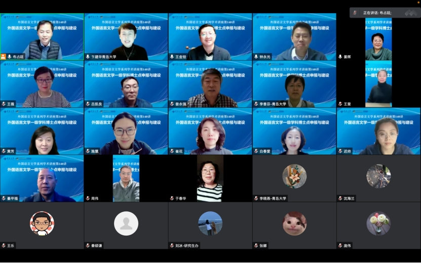 12月14日晚上,太阳集团城8722通过腾讯会议举行了外国语言文学一级学科博士点申报与建设讲座。学院班子、学科负责人、学科骨干等40余人参加了此次讲座,人文社科处钟永光处长、研究生院姜辉副经理应邀出席,卞建华经理主持讲座。