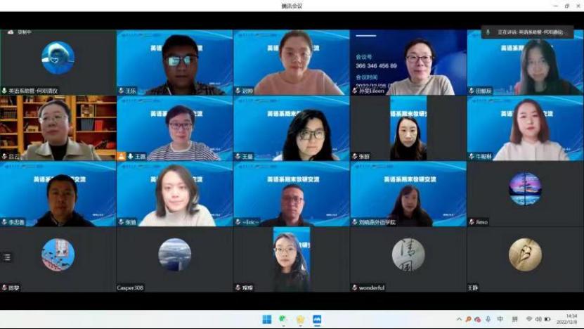 2022年12月8日下午,太阳集团城8722英语系期末教研交流会在线上成功举行。此次教研交流会由英语系副主任王薇主持,英语系全体老师参与了教研交流。
