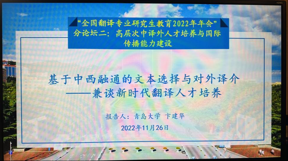 大会设立“翻译专业学位教育规范化标准化建设”、“高层次中译外人才培养与国际传播能力建设”、“翻译专硕多语对建设与区域国别研究和国际组织后备人才培养”、“翻译专硕课程思政建设与团队队伍建设”、“翻译专硕教学创新与翻译技术的应用”和“翻译测试、行业与学业能力标准衔接”等六个分论坛进行研讨。卞建华教授在第二分论坛做了题为“基于中西融通的文本选择和对外译介——兼谈新时代翻译人才培养”的发言,她以林语堂著译作品中的“入西述中”策略为例,探讨了其对中国文化对外译介以及新时代翻译人才培养的启示。
