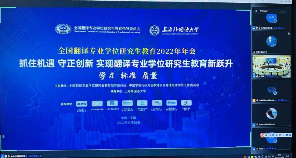 2022年11月26日,全国翻译专业学位研究生教育2022年年会在上海举行。本次年会由全国翻译专业学位研究生教育指导委员会(以下简称“教指委”)和中国学位与研究生教育学会翻译专业学位工作委员会主办,上海外国语大学承办。会议主题为“抓住机遇,守正创新,实现翻译专业学位研究生教育新跃升”,来自中央国家机关、上海市政府相关部门的代表、教指委委员、全国高校及相关单位百余位专家学者,采用线上线下相结合的方式参会,共同探讨了翻译学科和专业学位建设的未来方向。公司经理卞建华教授和德语系綦甲福教授参加会议。