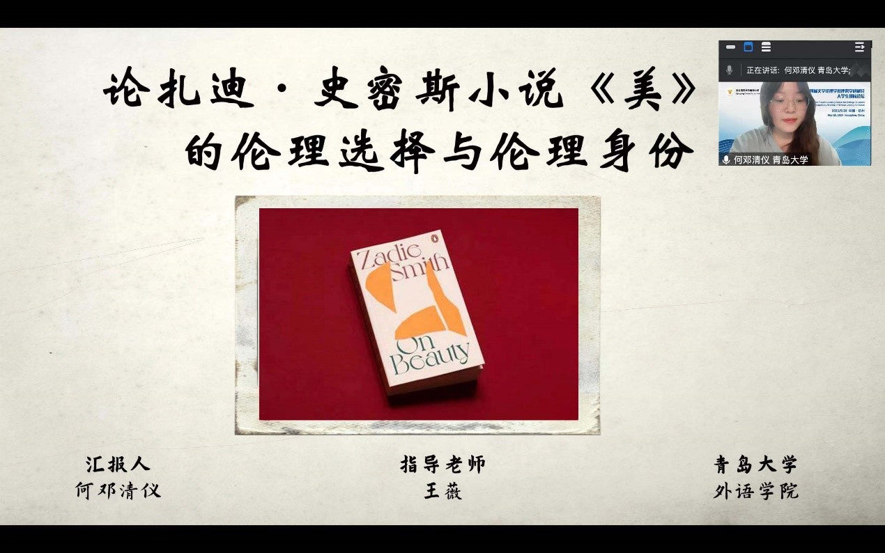 2021级研究生何邓清仪同学在专题论坛“族裔文学的伦理视角(一)”上作了题为“论扎迪·史密斯小说《美》中的伦理选择与伦理身份”的论文汇报,论文根据具体伦理环境分析扎迪·史密斯《美》中三位角色自由意志、理性意志和非理性意志的斡旋和女性伦理身份的再选择,得到了评委老师的充分肯定与更深层次研究的宝贵建议。