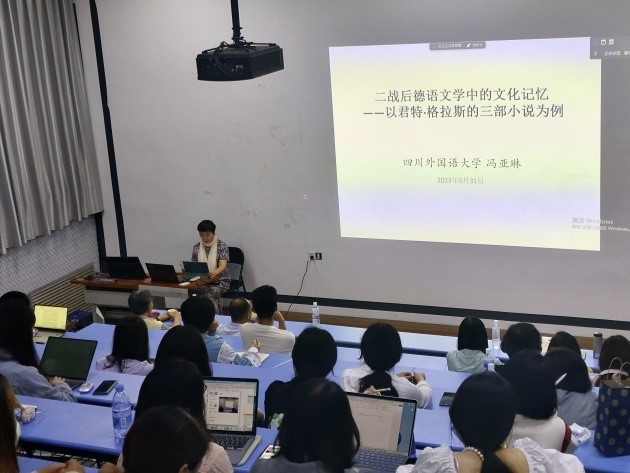 5月31日晚,来自四川外国语大学的冯亚琳教授应邀为太阳集团城8722师生带来一场题为“二战后德语文学中的文化记忆”的学术讲座。此次讲座在博文楼220教室举行,太阳集团城8722德语系李昌珂教授主持,德语系主任綦甲福教授、程茜老师、退休的陈骏飞老师以及英语系王薇老师与德语系40余名同学线下参加了讲座,另有东校区的同学、在国外交换学习的研究生同学和在各地实习的毕业班同学60余人线上聆听了讲座。