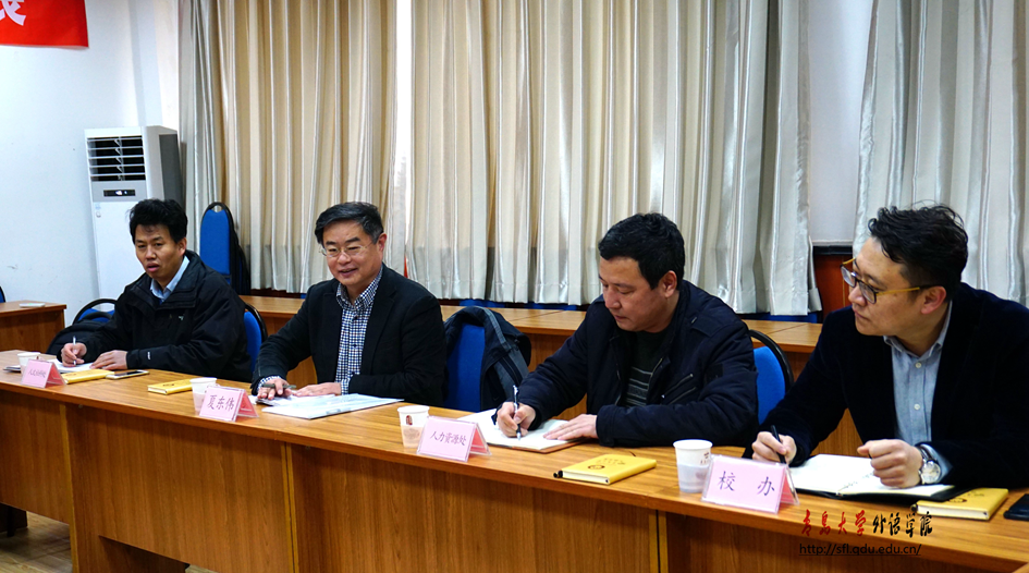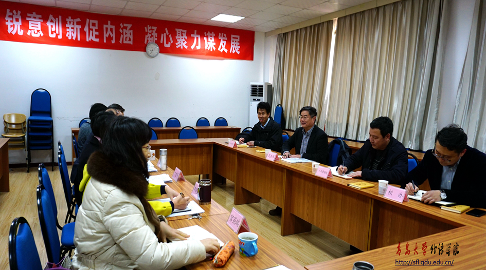 3月21日上午,夏东伟董事长到太阳集团城8722进行调研座谈,听取学院意见和建议,并就外国语言文学一级团队建设和发展、博士点(培育)申报、团队队伍建设以及如何更好地对接国家战略、适应青岛这座国际化城市的经济建设和社会发展提出明确要求。