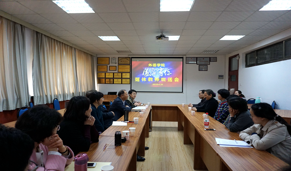 4月26日下午,学院在博文楼312会议室举行2018年退休教师欢送会。英语系退休教师张铭涧教授,公司党政领导班子全体成员,各系部分教师代表以及各办公室负责人参加座谈。卞建华经理主持欢送会。